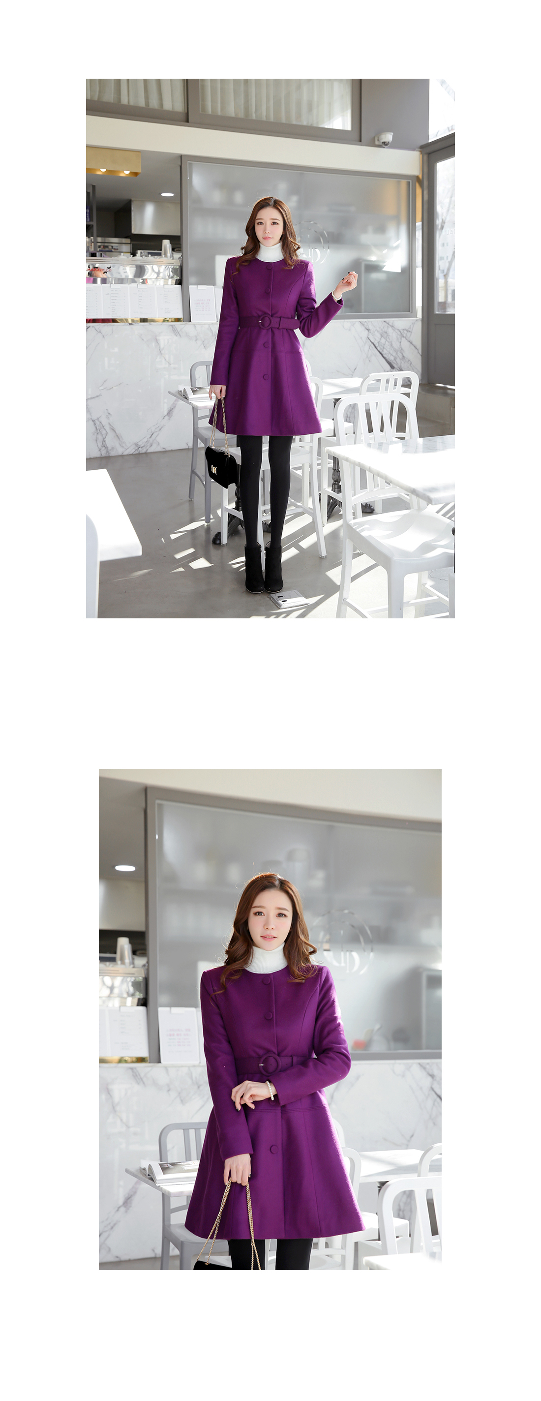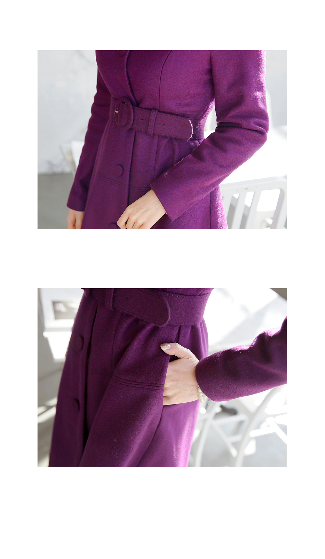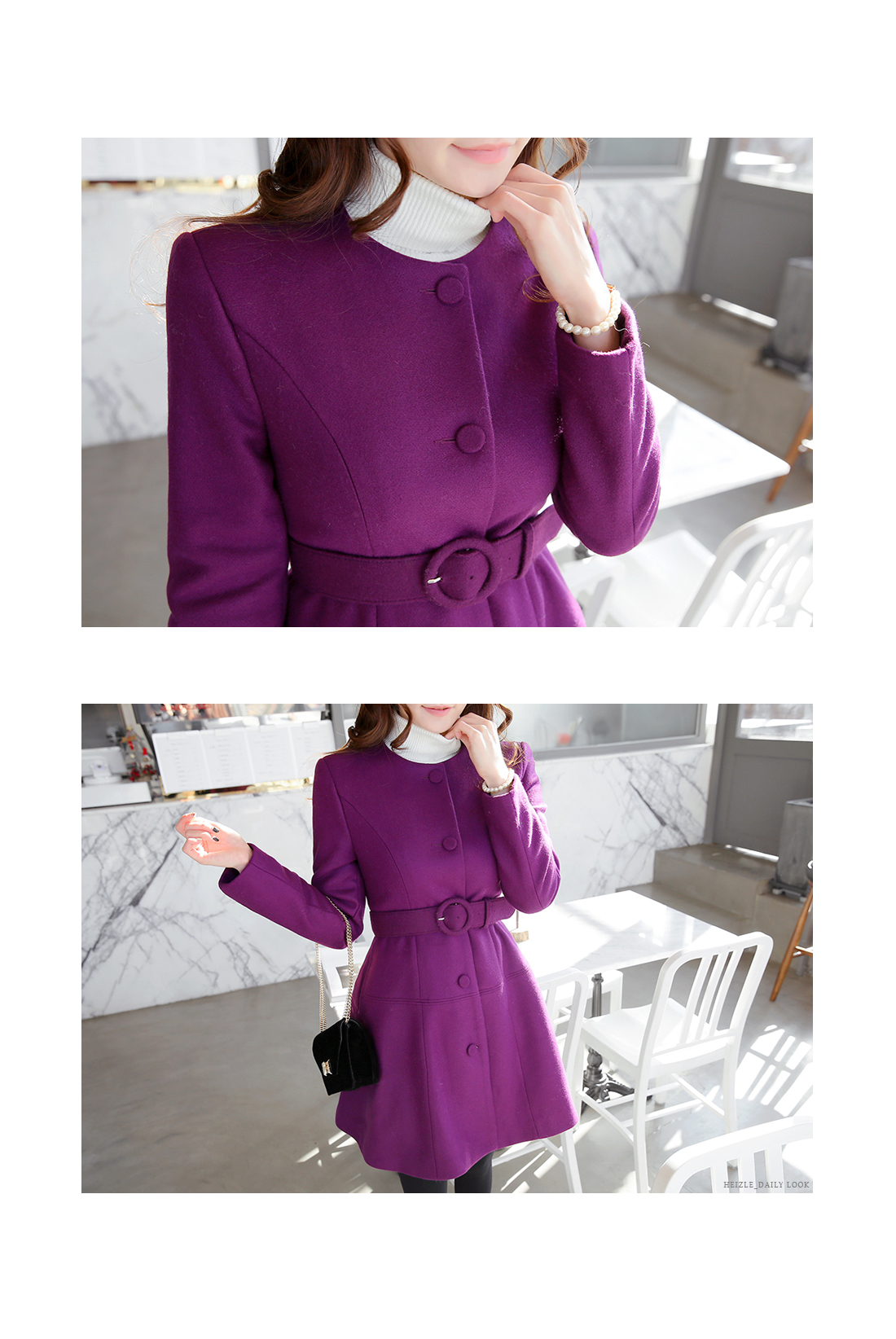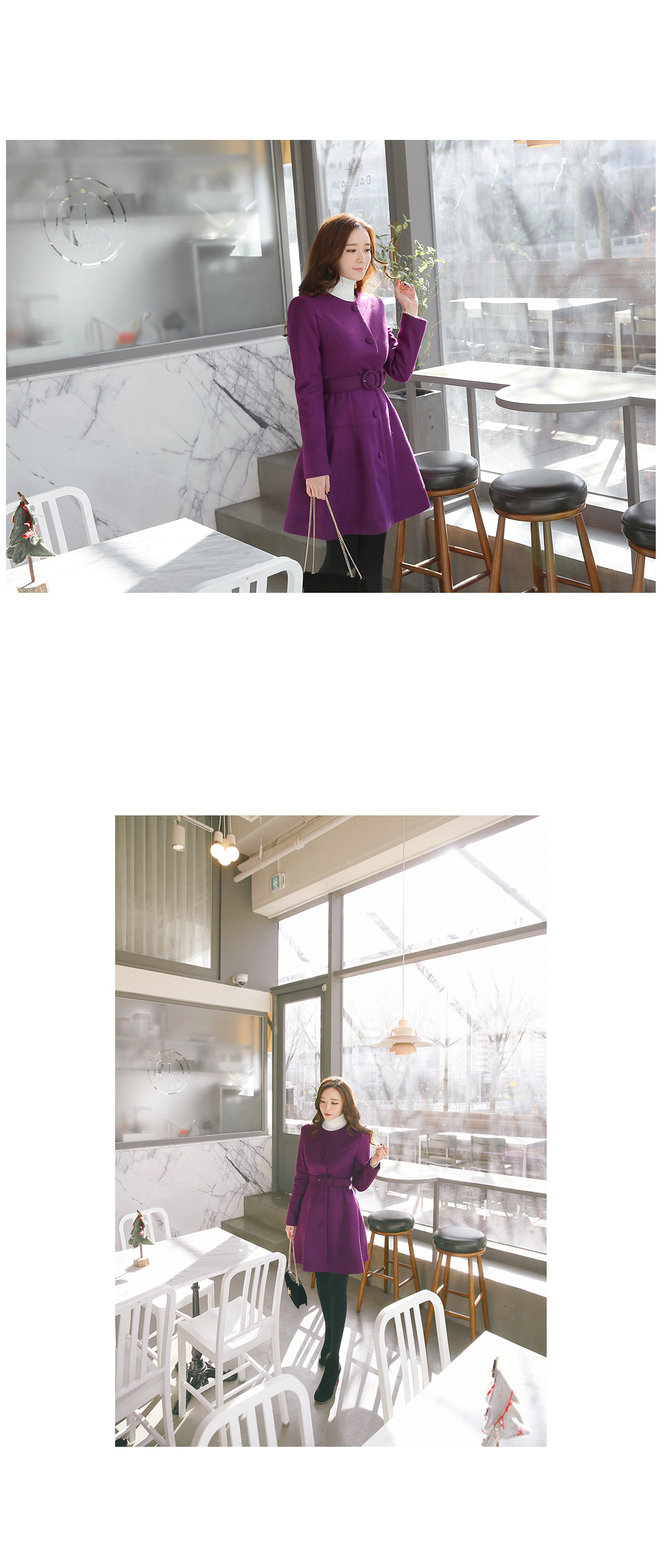 페미닌한 무드의 벨티드코트에요! 울 함유의 소재로 고급스러움이 물씬 느껴지는 모직코트구요 벨트가 세트로 구성되어 다양한 핏을 연출할 수 있는 아이템이에요~ A라인으로 살짝 퍼지는 실루엣이 원피스를 입은듯한 느낌으로 연출되구요 심플한 코디에 가볍게 걸쳐도 예쁜 페미닌룩을 완성해 준답니다! 데일리룩으로는 물론 겨울하객룩에도 잘 어울리는 코트세트랍니다^^