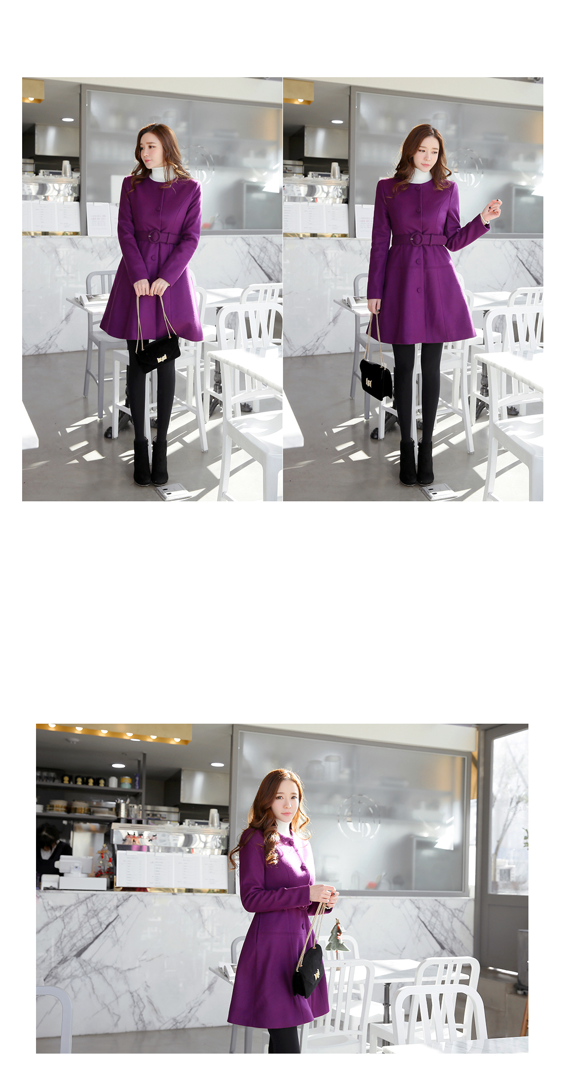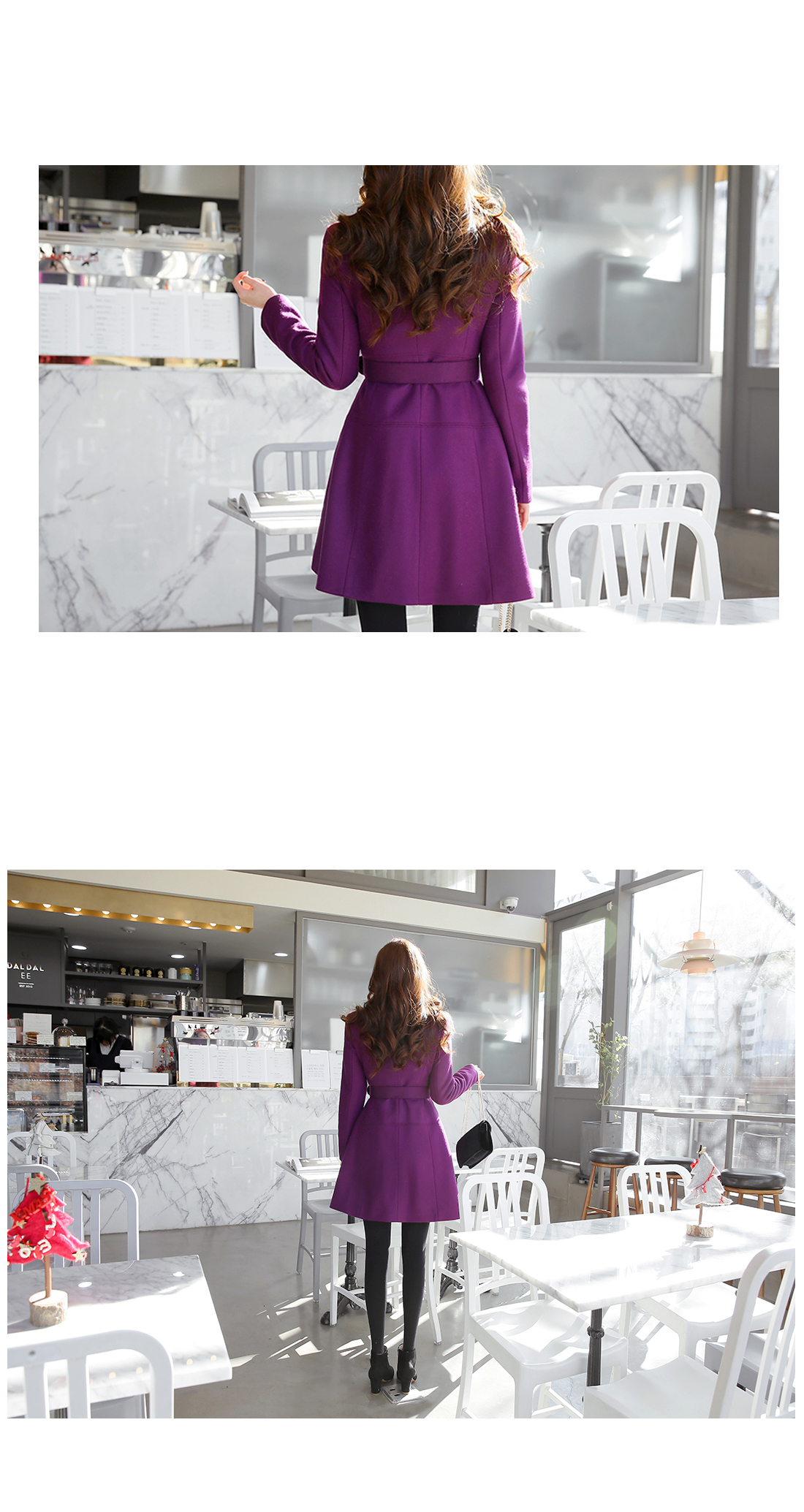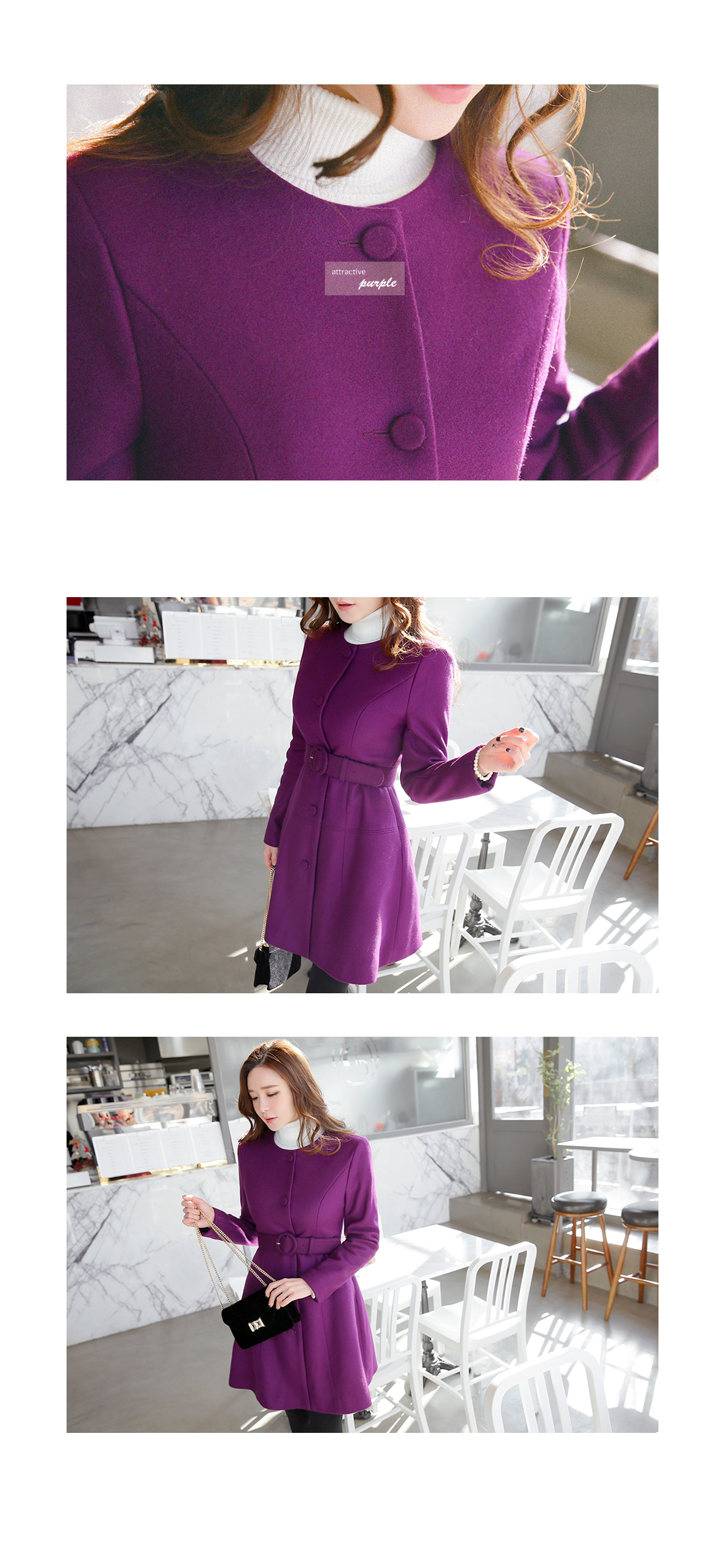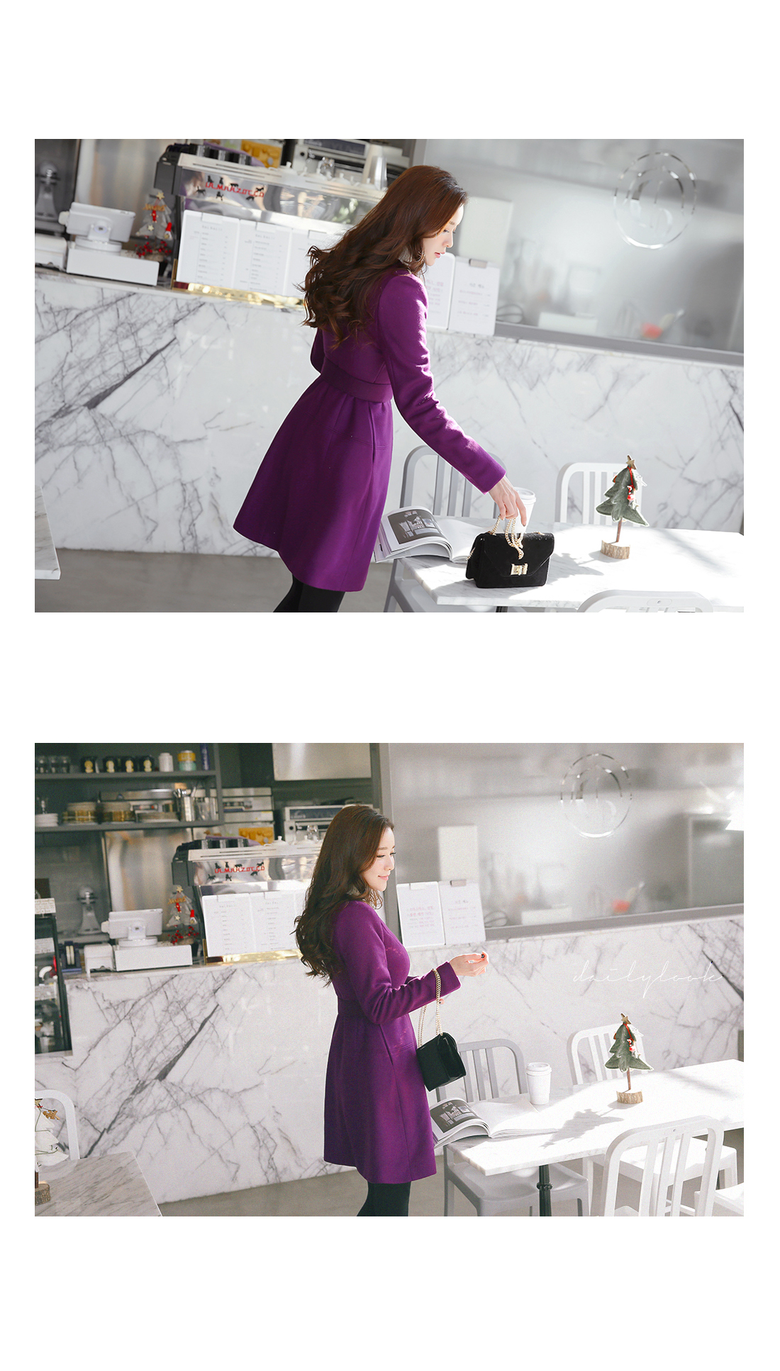 페미닌한 무드의 벨티드코트에요! 울 함유의 소재로 고급스러움이 물씬 느껴지는 모직코트구요 벨트가 세트로 구성되어 다양한 핏을 연출할 수 있는 아이템이에요~ A라인으로 살짝 퍼지는 실루엣이 원피스를 입은듯한 느낌으로 연출되구요 심플한 코디에 가볍게 걸쳐도 예쁜 페미닌룩을 완성해 준답니다! 데일리룩으로는 물론 겨울하객룩에도 잘 어울리는 코트세트랍니다^^
