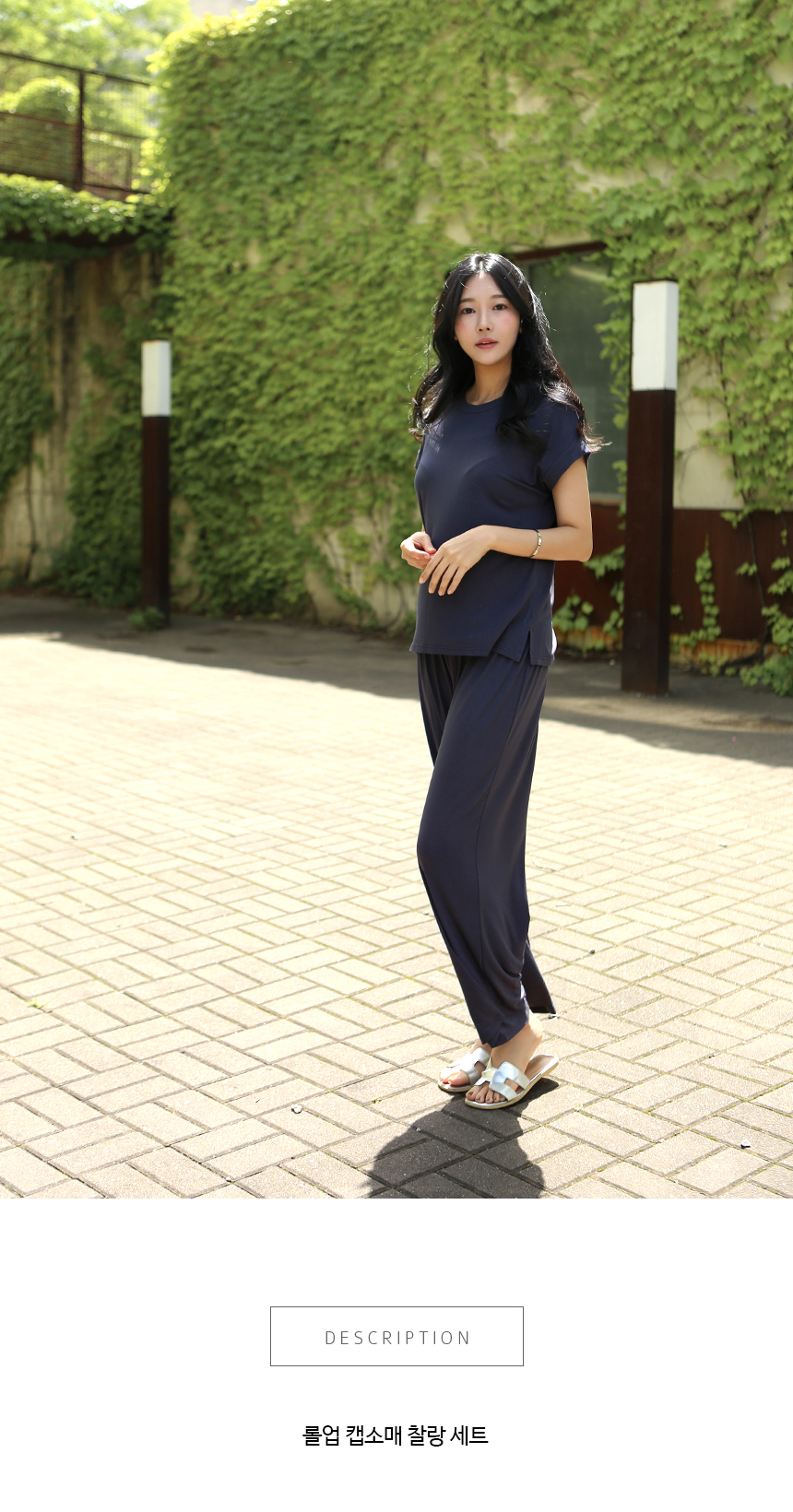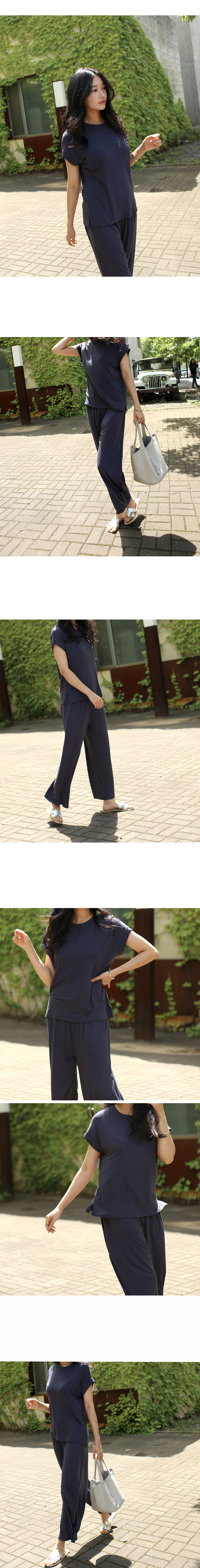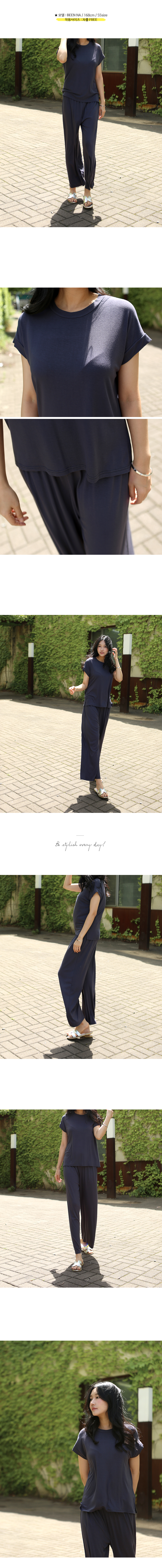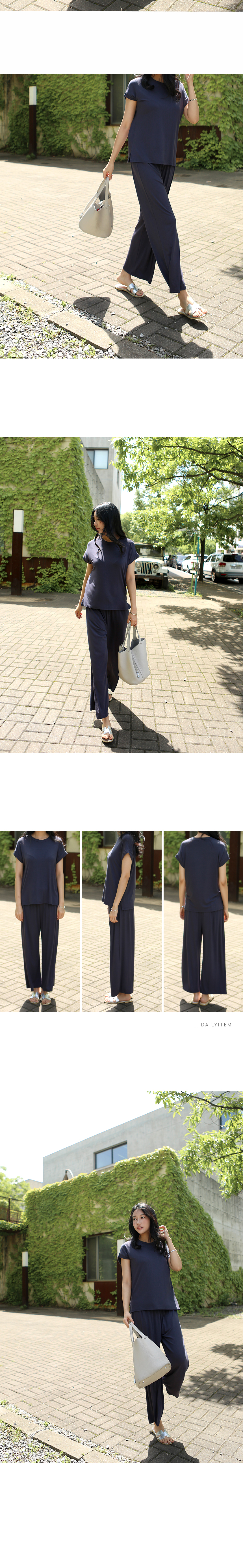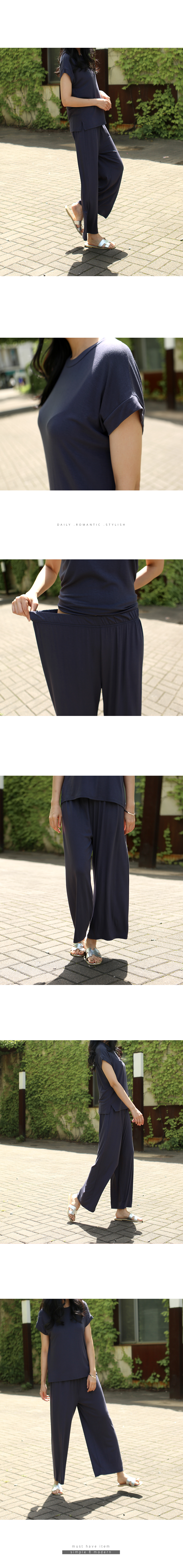 레이온소재 특유의 얇고 부드럽게 바디라인을 따라 흐르는 촉감이 포인트인 롤업 캡소매티셔츠와 밴딩 와이드 팬츠 세트상품이에요