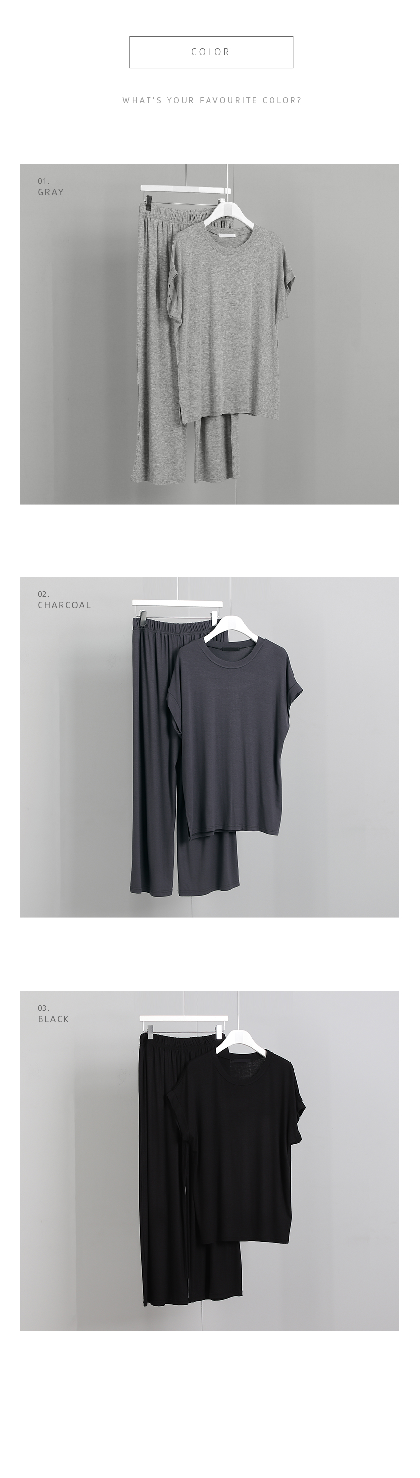 부드러운 소재감과 편안한 핏에 심플한 디자인으로 각각 따로 입어도 좋고 세트로 홈웨어부터 데일리룩까지 다양하게 활용하기 좋은 가성비 최고의 아이템으로 추천 드려요~