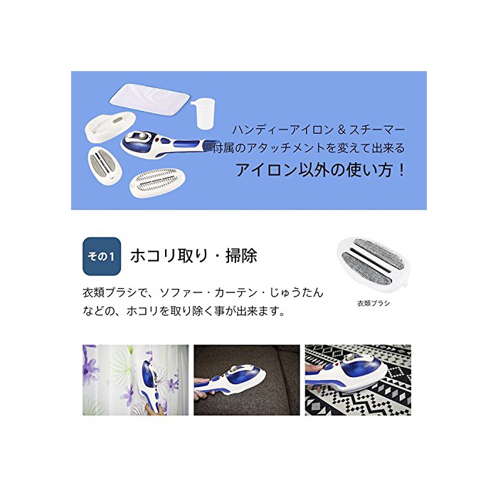 2WAY핸디 아이런&핸디 스티머(Steamer):브러시를 다른 것 하면 소형 steam 아이런으로 해 쓸만합니다.아이런이 걸어(걸쳐) 면은 세라믹,보통의 불소 수지 도장 보다 더 균일하게전열,균일하게 의류에 아이런을 거는(걸치는) 것 를 할 수 있습니다. 핸디 스티머(Steamer)로서도 옷을 행거에 건(걸친) 채로 쓸만합니다.세로로 늘어섰 6《고》의 steam 분출 입으로부터 steam을 공급합니다.외출 전의 양복의 약간의 주름 늘려 등에 대활약.양복으로 얼룩 붙었다 담배의 연등의 냄새 대책으로도 쓸만합니다.브러시와 의류 브러시의 2종류의 어태치먼트가 부속.의류에 부착한 쓰레기나 먼지를 없애는 것으로(에) 편리합니다.