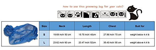 Size:S, Neck: 19.69inch/50cm, Chest: 27.56/70cm, Length: 15.75inch/40cm, Suit for cat weight below 4.4 lb Size: L, Neck: 23.62inch/60cm, Chest: 35.43inch/90cm, Length: 20.47inch/52cm, Suit for cat weight above 4.4 lb