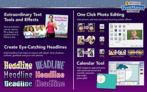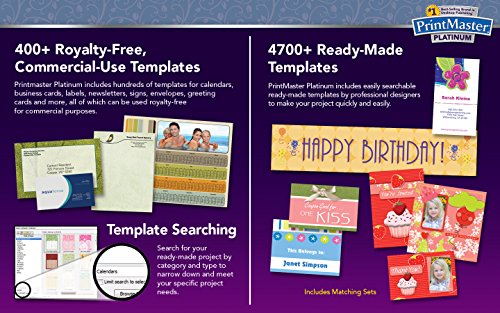 Let your creativity soar with Print Master v7 Platinum, the ultimate design software for personalized print projects. Get started with one of 4,700+ inspiring templates or start from scratch to design a truly unique creation. Add flourish to any project with more than 165,000+ irresistible images and photographic elements. With over 10,000 royalty-free images and 400+ royalty-free templates, you can create beautiful projects that are suitable for business and commercial use. Intuitive page layout tools, simple drag-and-drop for photos and clip art, and easy-to-use effects slider tools create impressive greeting cards, banners, signs and crafts like custom calendars, scrapbooks, doorknob hangers, party bags and more! Impress friends and family with projects printed at home, or use the integrated professional printer for premium results. With Print Master v7 Platinum, the only limit is your imagination! New in Print Master v7 Platinum: 10,000+ brand new, royalty-free, commercial-use images. Easily search for images that can be used for commercial purposes - royalty free! An all new sleek and modern user interface for improved usability! The new text flow and control feature allows text to overflow from one text box to another and the improved text wrap feature allows text to flow around images and clipart. Manage your mailing lists for labels, envelopes, letters or any mail project. Import or enter your contacts and create separate contact groups for your home and business needs. Create a single master page design that can be automatically added to all other pages in your project. New Photo fonts, paint brushes and styles! New right-click snap to guideline, center and edge options! Please note: Only Print Master versions 2011, 2012, 5.0, and 6.0 can be imported into Print Master v7 Platinum. Projects from any other version of Print Master will not load and import into Print Master v7.