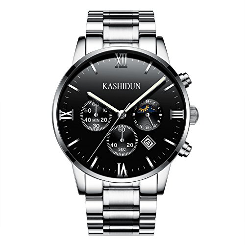 -. Feature : Classic Men's watch design with Japanese quartz movement, Guarantees precise and punctual timing / Durable and lightweight stainless steel case and band with fold-over-clasp closure / Chronograph functions and Date window(an easy to operate date window is located at 4 o'clock) / Protective sapphire crystal protects the watch from scratches, Three sub-dials track seconds, minutes, hours with stainless steel case and black dial window / Waterproof: water resistant to 30 meters(99 feet), in general, withstands splashes or brief immersion in water, but not suitable for swimming or bathing; If you have any questions, Please feel free to contact KASHIDUN After-sale Service Email: kashidun.ur@hotmail.com