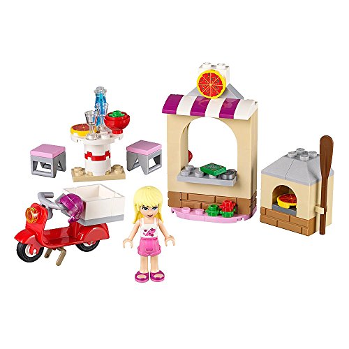 Includes a Stephanie mini-doll figure, a scooter with delivery box, counter, pizza oven, table and 2 stools