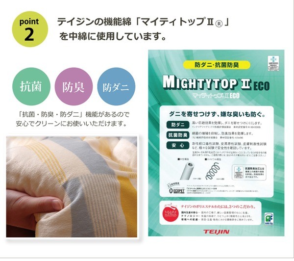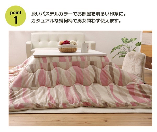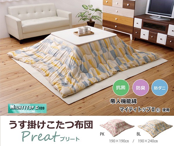 機能性を重視したこたつ布団です。帝人の抗菌・防臭・防ダニ機能の綿を使用しています。収納も簡単な薄掛けタイプです。