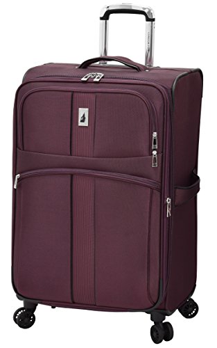 -. Feature : Hyperlight, dobby weave accent with contrast striped ballistic material. / Ergonomic comfort grip locking telescoping handle and 8-wheel low profile 360 degree multi-directional wheels. / Full London Fog striped lining and interior shoe pockets and 3 zippered storage pockets. / Expands 2" for additional packing capacity. Top, side and bottom carry handles. Ergonomic signature zipper pulls, on self repairing nylon zippers and corner guards for extra protection. / 11x17x25
