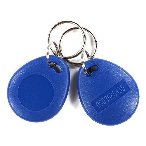 -. Feature : 125KHz EM4100 key fob (READ ONLY, NOT RE-WRITABLE). / Material: waterproof durable ABS; Size: L37 x W30 x T8.16mm; Includes 10pcs Blue RFID keyfobs. / Each RFID key tag has a unique serial number, and the serial number is laser engraved on back side, which is not easy to be removed. / Good looking, practical robust housings, high performance, and each keyfob attached with a metal ring. Reading distance roughly 6cm. / Widely used for access control and time attendance systems, Not compatible with UHF reader and encrypted readers, for example, HID, Cobra, APCiK, Paradox, Radio, Isonas,etc. In addition, can NOT work with Onity Locking System.
