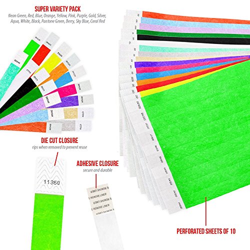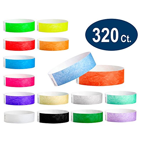320 ULTIMATE VARIETY PACK 3/4 INCH TYVEK WRISTBANDS FROM WRISTCO - You will receive 20 wristbands (2 sheets each) of Neon Green, Blue, Red, Orange, Yellow, Pink, Purple, Gold, Silver, Aqua, Black, White, Pantone Green, Berry, Sky Blue, Coral Red. The 320 wristbands are packaged in sheets of ten. Each wristband measures 3/4 inches wide by 10 inches long and will fit most wrists. Each armband is numbered for security and identification.