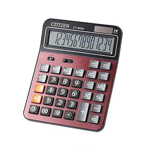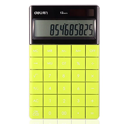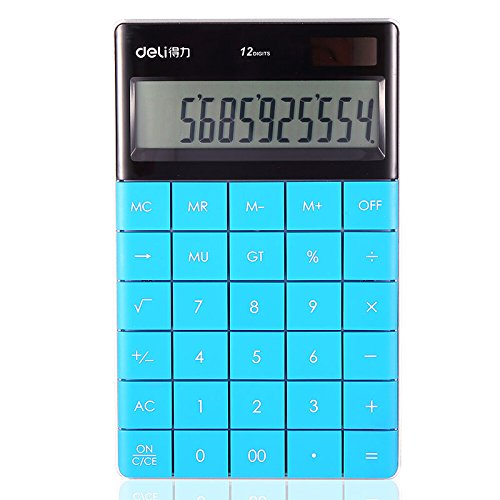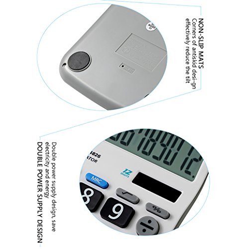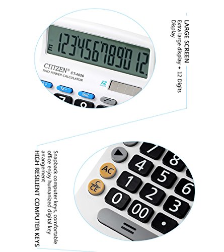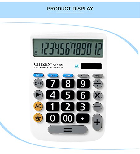 2:12-Digits Plastic buttons Plus UV varnish surface, wear, durability, tap more comfortable Extra large easy-to-read big display Constants for +, - , x, ÷ Independent memory Mark-up, percent, P key, Profit Margin 3-digit comma markers Solar power supply with button battery back-up.b>