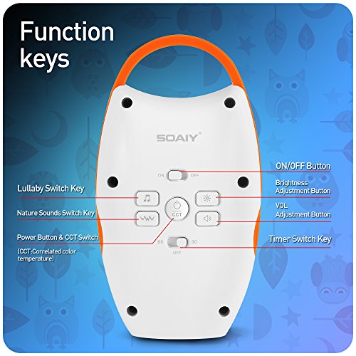 Studio : SOAIY Publisher : SOAIY Binding : Baby Product Product Description Our sound machine is cute owl model,to create various of hypnotic sounds, it can imitate a sleeping scene. Create an enjoyable and relaxing bedtime experience for children fall asleep fast. You could use it as a night light with soft glow brightness, it will not hurt your children's eyes, but add more happiness to your house,and improve your sleep quality. Package List 1*User Manual 1*Sound Machine 1*Screwdriver 1*Screw Kit Warm Tips: The batteries are not included. We adviced that you could buy rechargeable batteries for long time use to save energy and money. 0