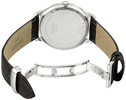 Stainless steel case with a brown leather strap. Fixed stainless steel bezel. Silver dial with silver-tone hands and alternating index and Roman numeral hour markers. Minute markers around the outer rim. Date display at the 3 o'clock position. Quartz movement. Scratch resistant sapphire crystal. Case diameter: 42 mm. Round case shape. Butterfly clasp. Water resistant at 30 meters / 100 feet. Functions: date, hour, minute, second. Dress watch style. Watch label: Swiss Made. Tissot Tradition Gents Brown Leather Stainless Steel Mens Watch T0636101603800.Feature