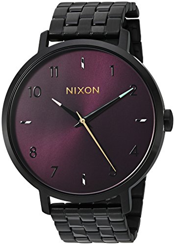 Nixon® takes aim at style with The Arrow. Nixon's Nailed It Collection features custom hands for a manicured look. Miyota Japanese quartz 3 hand movement and crown placement at 3 o'clock. The dial features numbered indices. 38mm, stainless-steel case. Hardened mineral crystal. Screw-down caseback. 17.5mm stainless-steel, 5-link bracelet with a stainless steel locking clasp. Imported. Measurements: Case Height: 38 mm Case Width: 38 mm Case Depth: 7 mm Band Width: 2⁄3 in Band Circumference/Length: 7 1⁄2 in Weight: 2.4 oz This product may have a manufacturer's warranty. Please visit the manufacturer's website or contact us at warranty@support.zappos.com for full manufacturer warranty details.Feature