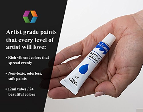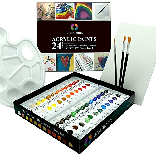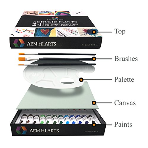 - 🖌 YOU NO LONGER NEED TO SEARCH the internet or in stores to find art supplies to get started on your creative acrylic painting journey, nor do you need to spend hours searching for many items to combine into a gift for a friend or loved one who could use the joy of creative expression. Our complete acrylic paints include 24 tubes of high-quality odorless acrylic paints, 3 brushes, 1 white professional canvas & a palette, all contained in a sturdy box ideal for storage and travel