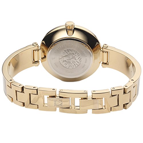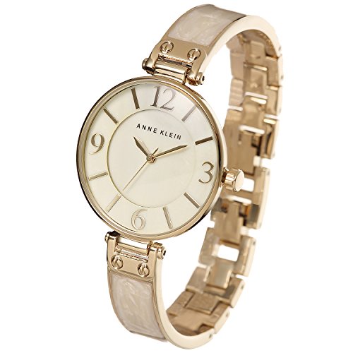 Rose gold-tone metal case. Marble acetate bracelet with jewelry clasp closure. Round face. Three-hand analog display with quartz movement. Mother-of-pearl dial features gold-tone hour markers and hands and Anne Klein detailing. Water resistant 100ft.Feature