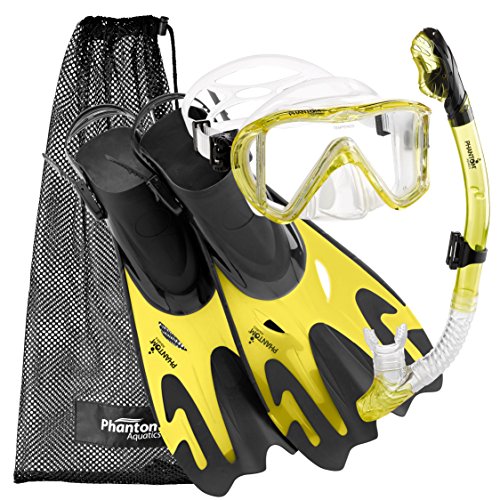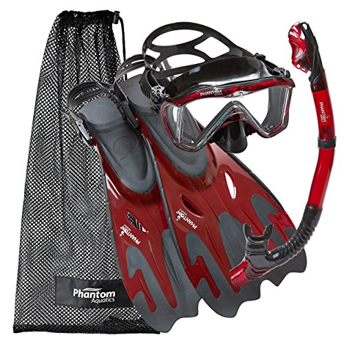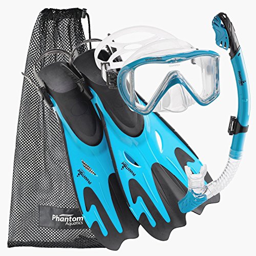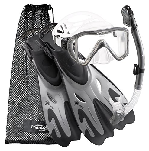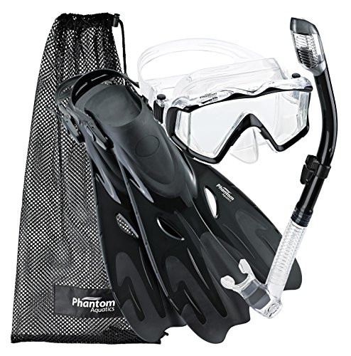 An amazing underwater world awaits - all you need is a set of snorkeling gear to get started. The Phantom Aquatics Legendary Pro Snorkeling Set includes everything you need - the Panoramic Mask, Silicone Dry Snorkel, Open Heel Adjustable Fin, and a reusable travel bag. The Dry Snorkel is 100% submersible, with a hypoallergenic silicone mouthpiece and flex section. Start on your next adventure with a Phantom snorkeling set.Feature