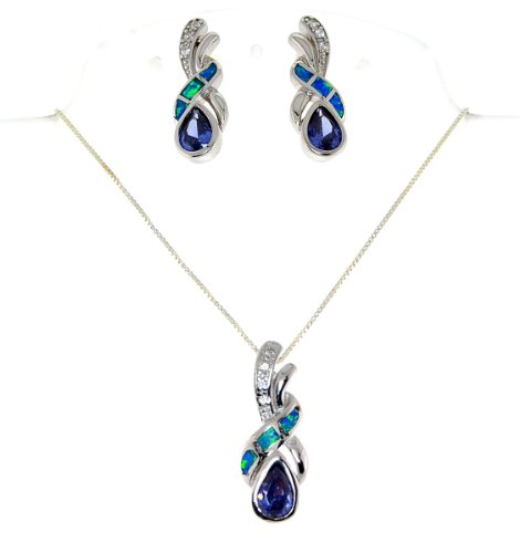 -. Title : Sterling Silver Created Opal and Simulated Tanzanit Necklace Earring Set