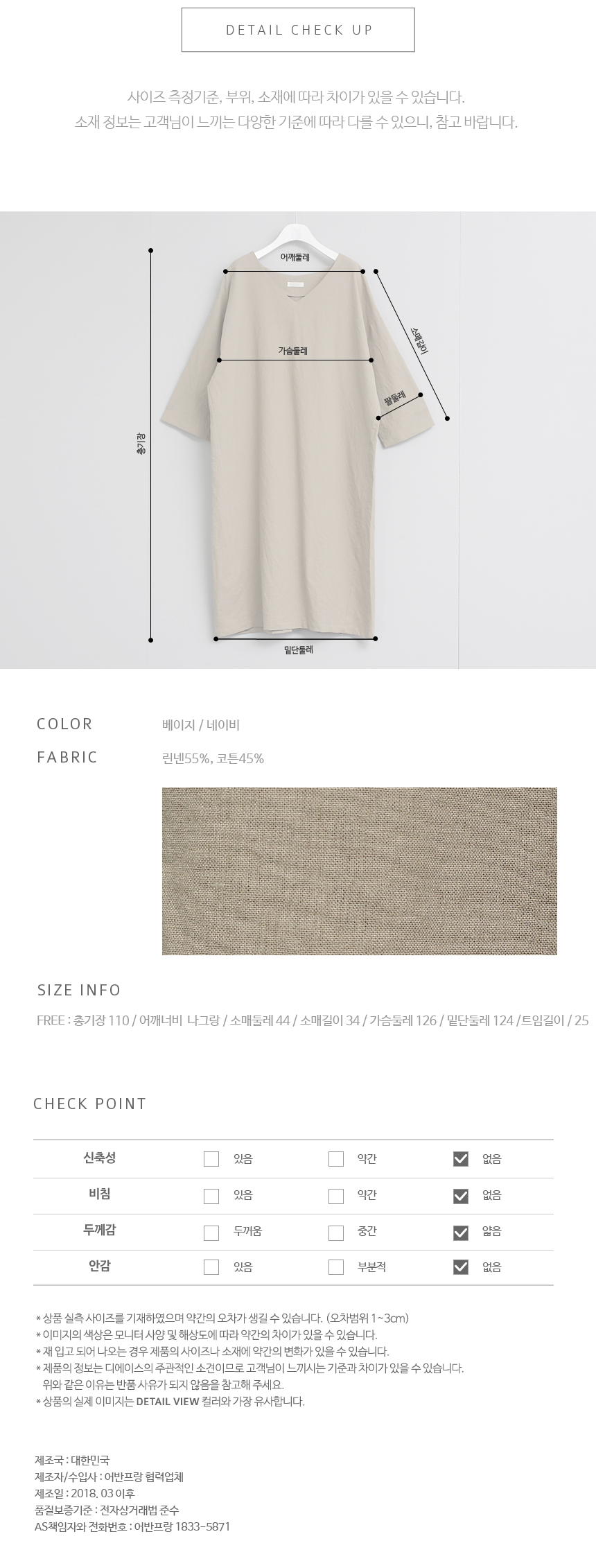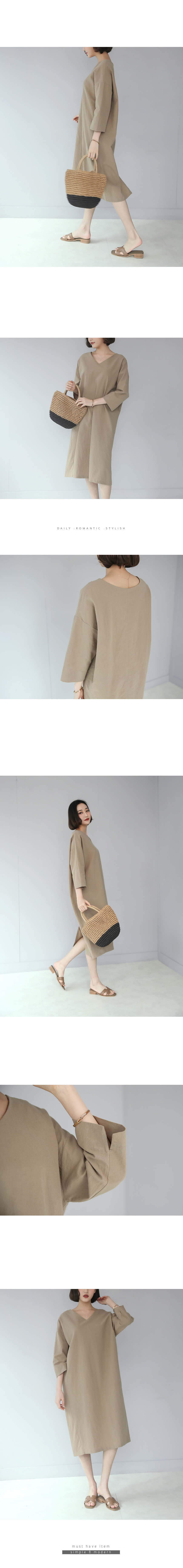 린넨과 코튼 혼방으로 가볍고 네추럴한 질감에 심플하고 여유있는 편안한 핏이 잘 어우러지는 원피스랍니다 단아한 브이넥과 넉넉한 핏으로 단정하면서도 편안해 액세서리 연출에 따라 데일리룩, 오피스룩, 하객룩등 다양하게 활용하기 좋은 아이템이에요 고급스러운 소재와 라인으로 연령에 상관없이 잘 어울리는 원피스에요 색상은 베이지, 네이비 사이즈는 FREE 44~77