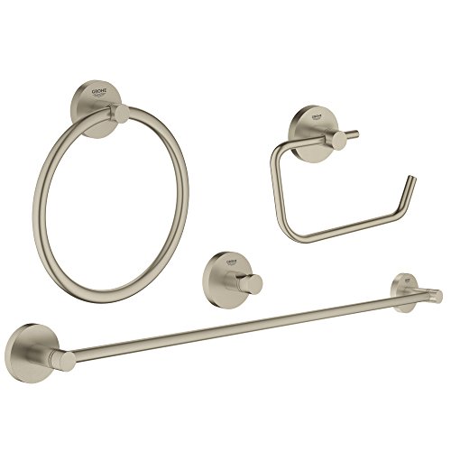 - Comprising towel ring, 600-mm towel rail, robe hook and toilet paper holder, the GROHE Essentials accessory set finished in Brushed Nickel is the perfect choice for your bathroom