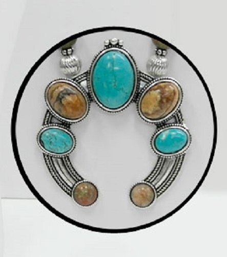 -. Feature : Squash Blossom Long Necklace Set. Size: 35"L / 2 Tone color stones / Squash Blossom Size: 3"L x 2.7"W / Rhodium plated Lobster Claw Closure / 2.5 ext Inch Necklace Length