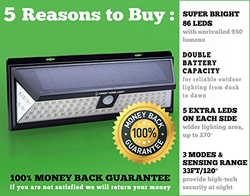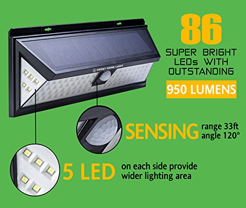 Solar Powered Security Lights with 86 leds, Motion Activated Outdoor Lights, Outside Solar Lights, Motion Sensor Solar Patio Lights, Solar Deck Lights or Solar Fence Lights from SweetHomeLight
