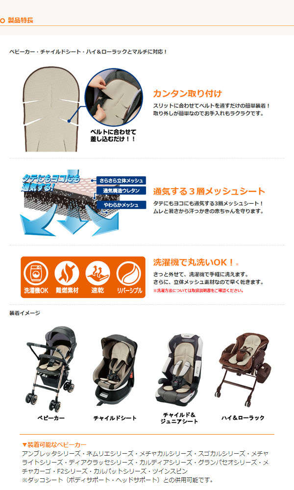 ●コンビのベビーカー・チャイルドシート・ハイ&ローラックにマルチに対応する「さらすやエアスルーシート」は、通気する3層メッシュシートで汗っかきの赤ちゃんをムレと暑さから守ります