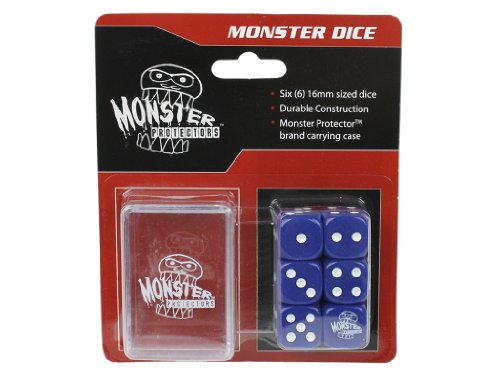 Studio : Moster Protectors Publisher : Moster Protectors Binding : Toy Product Description Dice - Monster Protectors Set of 6 D6 Logo Die with Pocket Carrying Case (Blue): The world's #1 premium gaming album company has done it again with Monster Dice. You have your choice in Dice supplies, but Monster Dice will change the way you look at dice. Perfectly weighted, high resolution logoed, and easy to transport in an included plastic tight fitting carrying case, your game just got blinged! 0