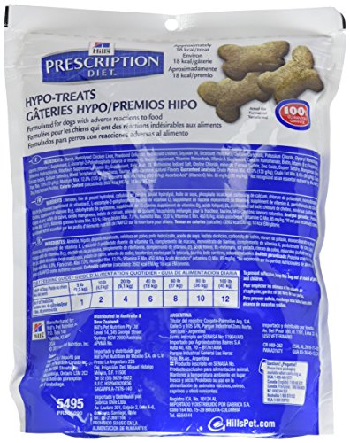 -. Binding : Misc. -. Brand : Hill's Pet Nutrition -. Department : dog-veterinary-diets -. EAN : 0052742549507 -. Feature : Hydrolyzed proteins to alleviate adverse reactions to food / Increased omega-3 and omega-6 fatty acids, including EPA, help to nourish the skin and coat / Added antioxidants to help support skin barrier function -. Label : Hill's Prescription Diet -. LegalDisclaimer : Please message to us your prescription from your veterinarian or contact our veterinarian for prescription that is approP.R.Iate for your pet. Thank you -. Manufacturer : Hill's Prescription Diet -. Model : HLL-444 -. MPN : 5495 -. PackageQuantity : 1 -. PartNumber : 5495 -. ProductGroup : Pet Products -. ProductTypeName : PET_SUPPLIES -. Publisher : Hill's Prescription Diet -. Studio : Hill's Prescription Diet -. Title : Hill's Prescription Diet Hypoallergenic Canine Treats - 12oz -. UPC : 052742549507