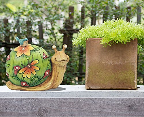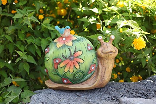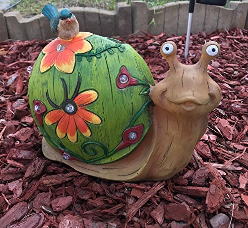 Made of Polynesian. Size: 10"Lx 5"W x 8.5"H. LED Snail illuminate at night. Includes one 300 mAh AA rechargeable battery and 8 LED lights. Manufacturer provides 1year limited warranty.