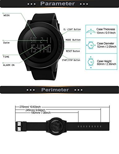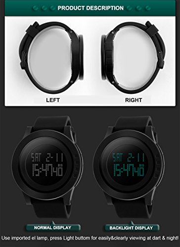 It's a minimalist all black big face sports outdoor digital watch. Fashion & Creation design, giving a strong visual impact and leading you to the edge of sport fashion; Comfortable and durable material make it perfect for all kind of sport and daily use, great gift for family and friends. Screw locked back cover, highly waterproof, easy to replace the battery.