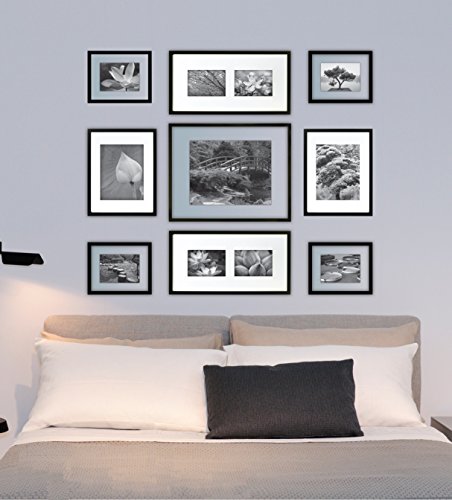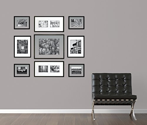 -. Feature : 9-Piece black wood frame set with 2 sets of usable artwork included / Includes 1 - 16"x20" float frame to fit an 11"x14" P.R.Int, 2 - 11"x14" matted to 8"x10", 4 - 8"x10" float frame to fit a 5"x7" P.R.Int, 2 - 10"x20" matted to 2 - 5"x7" / Hanging templates with easy to hang instructions and hardware included. / Everything you need to successfully hang a wall gallery delivered right to your door. / Hang these frames in your living space for an elegant gallery with a sleek, modern look.