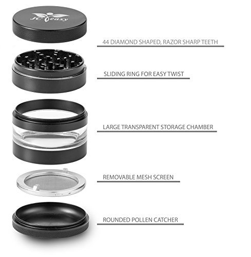•CLEVER DESIGN: Acrylic Window Section for instant visibility of fragrant herbs. Removable Stainless Steel mesh screen filters very fine pollen. Thin Poly O-Ring for smooth grinding and less friction.