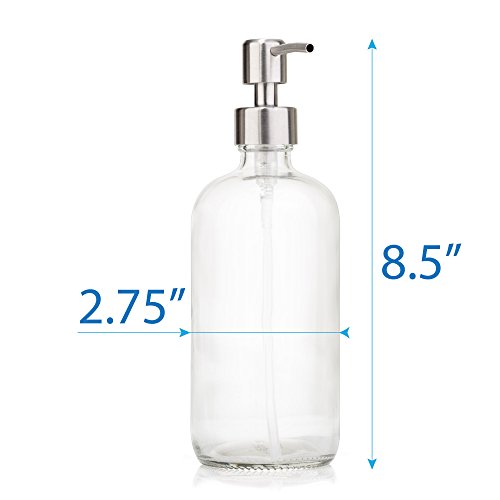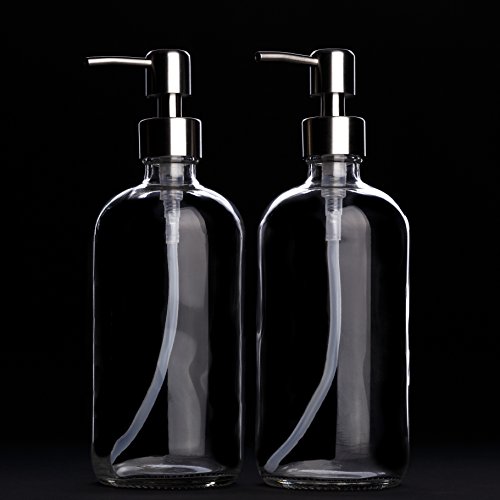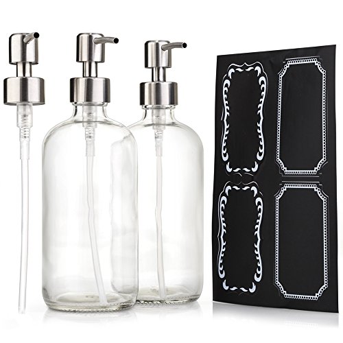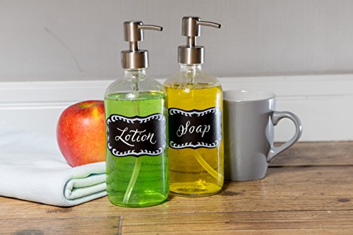 Glass Bottle Dispensers Pack Of 2 By Homey Cluster - Round Glass Body & Stainless Steel Pumps - 16oz Capacity - For Hand Soap, Essential Oils & Body Lotions - With 1 Extra Pump & 4 Chalkboard Labels