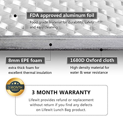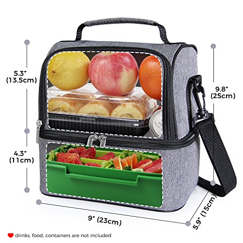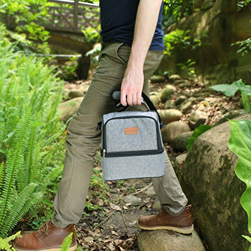 -. Feature : PREMIUM CONSTRUCTIONS & INSOLATION: The exterior of the Lunch Box is constructed out of 1680D water-resistant dirt-proof Oxford fabric for durability and water proofing and easy cleaning. The interior lining was made of food grade aluminum foil and padded with 8mm EPE foam for great thermal resistance. / DOUBLE DECKER DESIGN : Featuring two sections which allow you to store hot and cold foods separately. The wide opening allows for easy loading and unloading, and the premium zipper enables effortlessly smooth glide. / VERSATILITY : Premium aluminum foil lining offers great thermal resistance to keep food fresh and warm/cold. The bag is suitable to be used as a baby milk bag owing to its double-compartment design. Parents can store baby essentials in the bag and separate them from the foods. / COMPREHENSIVE DESIGN : Seamless one-piece aluminum lining elimates leakage problems, classic adult looking grey appearance with a padded handle and a detachable/adjustment shoulder strap that you could carry it in 3 modes?crossbody, shoulderbag and handbag, totally customizable for your different needs. / MEASUREMENTS & CAPACITY : The Lunch Bag's maximum capacity is about 7L. The overall dimensions of the lunch bag are 9.84*6.69*10.23 in / 25*17*26 cm ( L*W*H ). The top compartment could take at least 6 tins of coke and the height of the bottom section is approximately 4.33 in / 11cm. It's roomy for even the whole day food that you need.