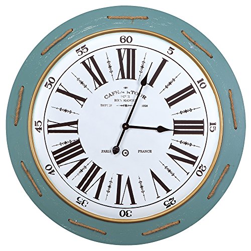-. Feature : 31.5W x 2.25D x 31.5H in. / Distressed mint-finished wooden frame / Large Roman rumerals on face / Features h.e.m.p rope looped through frame / Requires 1 AA battery (not included)