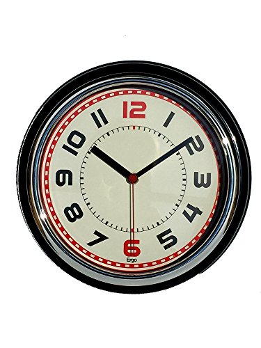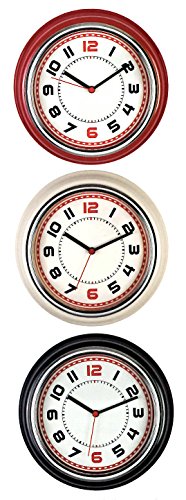 -. Feature : Retro style with big black number - 12 and 6 are red / Colored frame (red, ivory or black) with a beige background and red sweep / Silent sweep movement / Dimensions : 12 x 12 x 4 (thick) / Works with any AA battery (not included), keeps accurate time, Perfect clock for dining rooms, living rooms, family rooms, bedrooms, study room, kitchen, office, or conference room