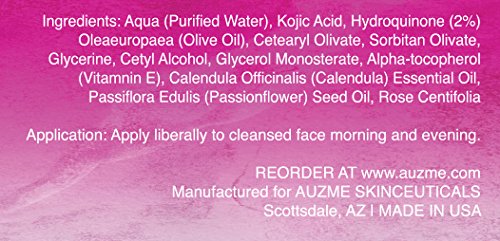 Meet Auzme's Clinical-Grade Skin Lightening Cream - Elite bleaching treatment that is gentle, yet effective. Ground-breaking skin whitening fomula now available for anyone looking to lighten, and brighten facial or body skin tones. Nature and science combine to create a wildly powerful, yet gentle skin bleaching mixture of Hydroquinone and Kojic acid in an easy-to-apply formula bottled with care and delivered to your doorstep. THE EXPERIENCE: When you're skin is treated with Auzme Advanced Skin Lightening Cream, the difference is a rapid change in sub-dermal melanin composition. See why thousands of reviews from real customers say they all experienced the same basic thing... lighter, brighter skin, vast improvement for those with melasma, dark spots, and skin discolorations. Cool, light formula in a silky smooth serum for use under makeup day or night. CRUELTY FREE: Formulated and bottled in the USA. 90-Day MANUFACTURER GUARANTEE - We stand by our products. If for any reason you decide that this serum is not a good fit for your skin, you have a ★ FULL 3 MONTHS ★ to contact us for a 100% money-back refund, absolutely no questions asked.Feature