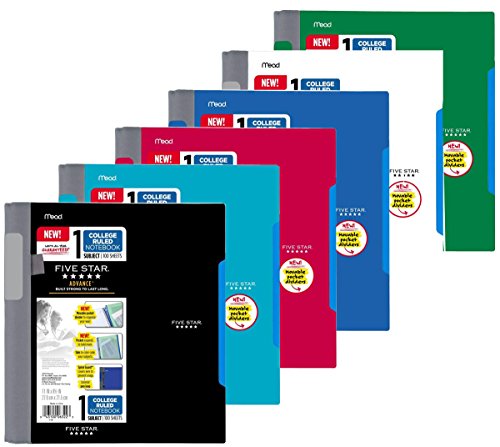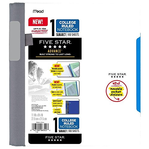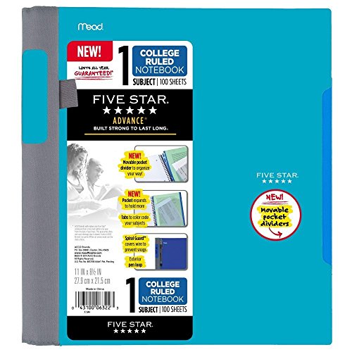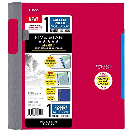1 subject notebook contains 100 college ruled perforate sheets. 11 in. x 8.5 Inch tear-out sheet size. Divider has an expanding pocket to hold more loose papers. Plastic front and back covers provide year long durability. Lasts All Year. GUARANTEED!*
