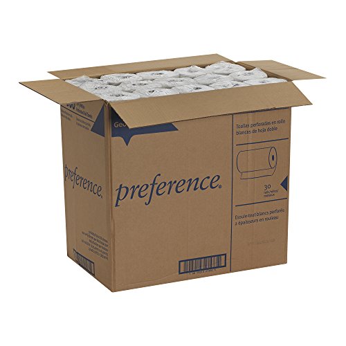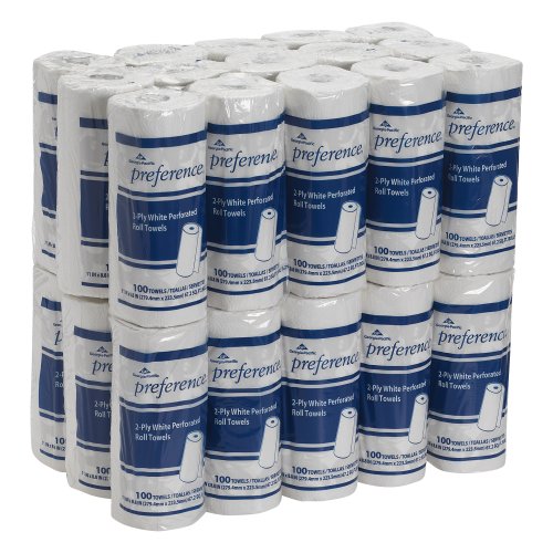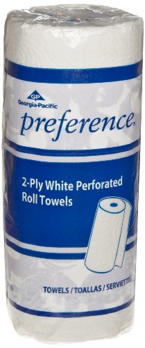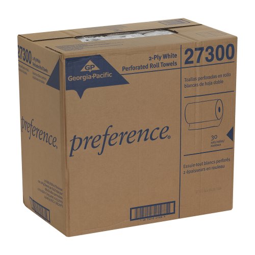 The Georgia-Pacific Preference 27300 white 2-ply perforated roll towel can be used for general-purpose cleaning and wiping. It is suited for use in food service, healthcare, laboratory, and clinic settings. The towel is made from 2-ply paper that absorbs liquids better than a 1-ply paper. Each towel is 8.8" long by 11" wide. Perforations in the towel roll allow dispensing a fixed size without a specialized dispenser.