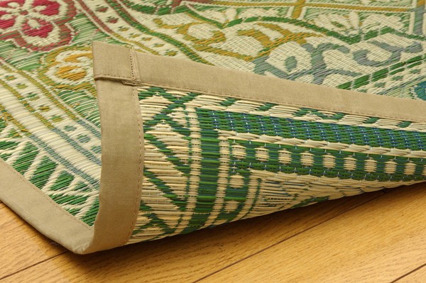 絵羽柄のエレガンス調花ござカーペットです。国産(九州産)のい草を使用しています。一本一本が太く、表皮が厚く繊維がキメ細かいので弾力性があり、耐久性に優れています。い草には空気の自然浄化作用、湿度の調節作用などがあります。また汚れにくく、使用するうちに黄金色に変化し味が出ます。い草に青森ヒバ加工を施しています。(抗菌、防臭効果)