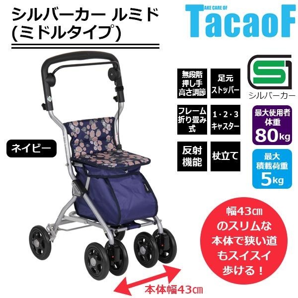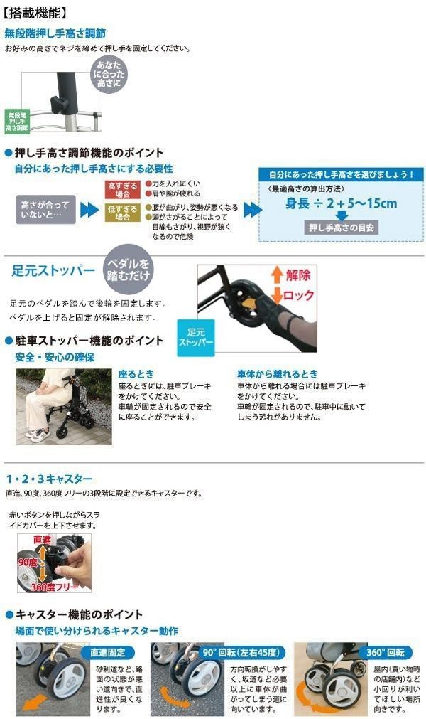 コンパクトタイプとスタンダードタイプの間に位置する、使い勝手の良いシルバーカーです。軽量でありながら安定感があり、適度な収納量なので、毎日のお買いものにも最適です。歩行で疲れた時は座って休むこともできます。 |