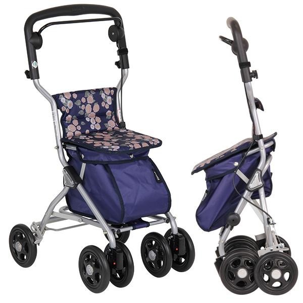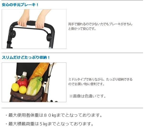 | コンパクトタイプとスタンダードタイプの間に位置する、使い勝手の良いシルバーカーです。軽量でありながら安定感があり、適度な収納量なので、毎日のお買いものにも最適です。歩行で疲れた時は座って休むこともできます。 |