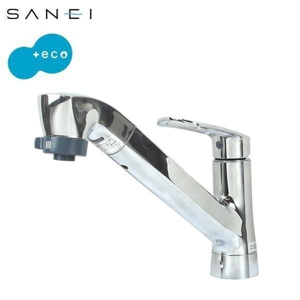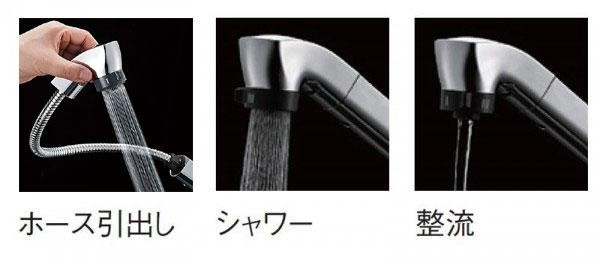 キッチン用のシングルワンホールスプレー混合栓です。エコ位置クリックでお湯が出ない位置をお知らせし、スマートにお湯のムダ使いを防ぎます。ホースが引き出せるので、水栓本体から吐水口を引き出して、自由な位置や方向に吐水できます。 |