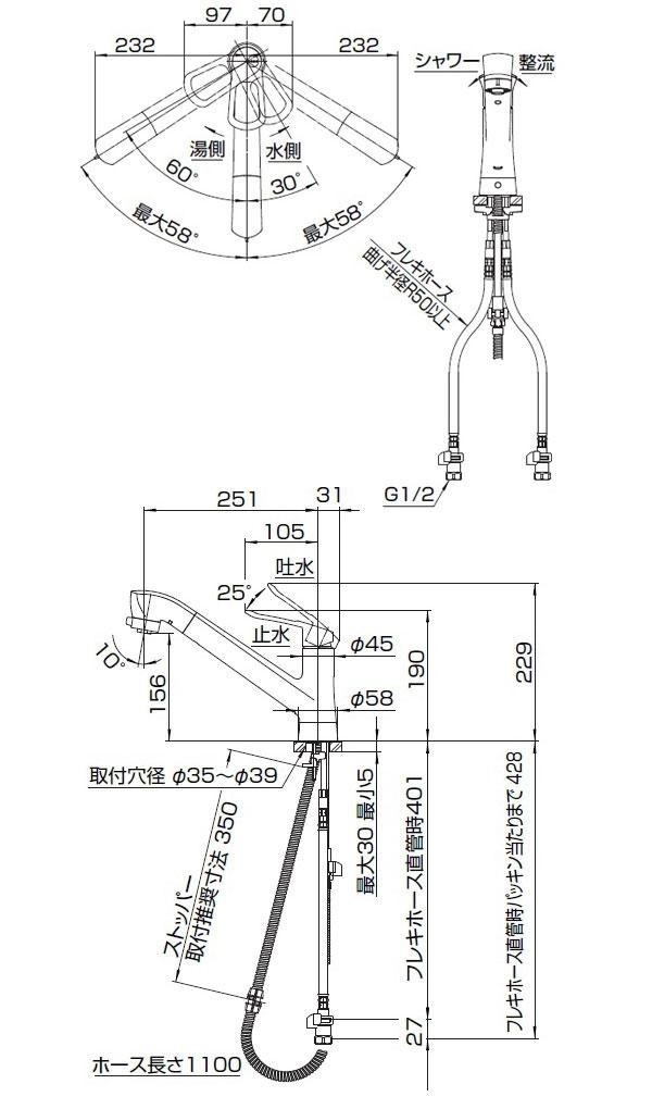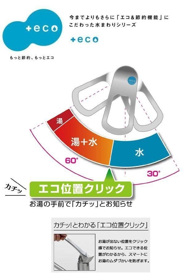 | 仕様 | JISマーク取得済 節湯C1、節湯B 節水水栓 エコ位置クリック 上面施工式 フレキ 吐水口116度回転 |