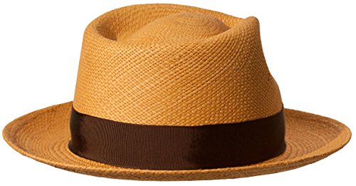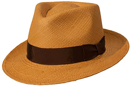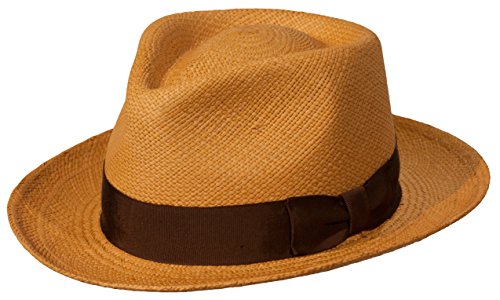 The Levine Panama Bogart is a tight weave Genuine Panama Straw Fedora with 2 1/2" classic snap brim and bogart pre-shape crown. The Bogart gets its name from icon Humphrey Bogart who wore a similar brim and block in many of his most famous movies. Levine Genuine Panama Hats are DuPont Teflon treated for exceptional durability and resistance to water, oil and stains. Whereas other, non treated hats will eventually crack or decay due to handling and the oils on your fingertips, our panama straw dress hats will last extra years due to their DuPont Teflon coating and will not crack, even if you occasionally forget to handle your handle your hat by the brim as you always should. Crown cracking is further prevented by the glued "crown tip" inside your hat which strengthens the front of the hats crown. This hat is trimmed with a basic gentleman's brown grosgrain bow band. The band is sewn close to the hat, and is approximately 1-inch in width for a classic look. The band is sewn on for a finished look and so that it will not fall off, but other hat bands can be hooked on over your existing hat band if you choose. The Levine Bogart Panama is finished with a DRI-CLOTH comfort cotton sweat band on the interior, which wicks away sweat and keeps you cool and dry. After a few wears, this band will self-conform, meaning that it will begin to form to the shape of your head. This hat is unlined for maximum breathability and comfort; it is ideal for Spring and Summer wear. Straw is Hand Woven in Ecuador under the moonlight. Blocked and Finished in USA. 0 |