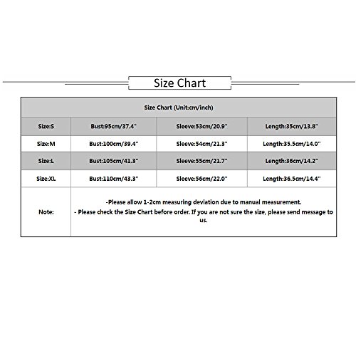 ?Size Chart(Unit:cm/inch) ?Size:SBust:95cm/37.4"Sleeve:53cm/20.9"Length:35cm/13.8" ?Size:MBust:100cm/39.4"Sleeve:54cm/21.3"Length:35.5cm/14.0" ?Size:LBust:105cm/41.3"Sleeve:55cm/21.7"Length:36cm/14.2" ?Size:XLBust:110cm/43.3"Sleeve:56cm/22.0"Length:36.5cm/14.4" ?Please allow 1-2cm measuring deviation due to manual measurement ?Please check the Size Chart before order. If you are not sure the size, please send message to us. 0