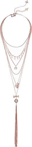 Show off your style with the help of this GUESS® necklace. Multistrand necklace with faceted crystals and tassel pendants. Rose gold-tone finish. Adjustable length. Lobster claw. Imported. Measurements: Chain Circumference: 12 in Adjuster Length: 2 in Cascading Length: 12 in Cascading Width: 3 in Weight: 1 ozFeature