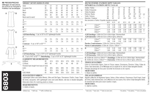 -. Feature : Misses Dresses in size A (10-12-14-16-18-20-22), New Look Pattern #6803 / Number of looks included: 5 / Designed in UK, Manufactured in USA / Instructions are written in English, Spanish, and French / Sested fabrics: Lightweight Cotton and Cotton Blends, Silks and Silk Types, Charmeuse, Challis, Crepe, Crepe De Chine, Jacquards, Soft Lightweight Linen and Linen Blends; A,B also in Double Georgette; allow extra fabric for matching plaids or stripes