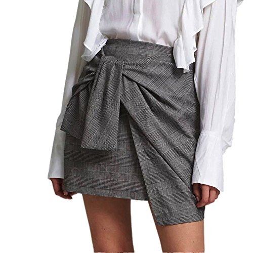 -. Title : 【ノーブランド】レディースレイヤード風アシンメトリーチェック柄ミニスカートグレーリボン