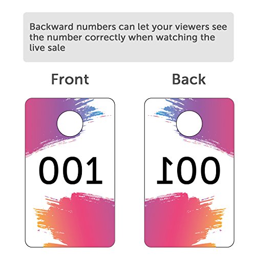 - 100 Pieces number tags: numbers from 001 - 100; One side is normal and other side is backward mirrored image numbers; Reverse numbers enable viewers to see the numbers correctly when watching your live sale
